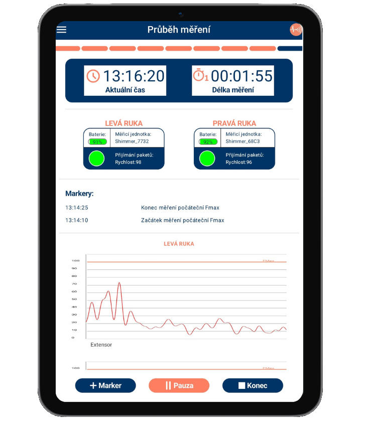 Mobilní aplikace s intuitivním ovládáním lehce provede i méně zkušené osoby procesem měření vybraných rizikových faktorů fyzické zátěže. Automaticky se připojí k senzorům, přijímá a ukládá měřená data. Zobrazuje stav baterky a průběh měření.